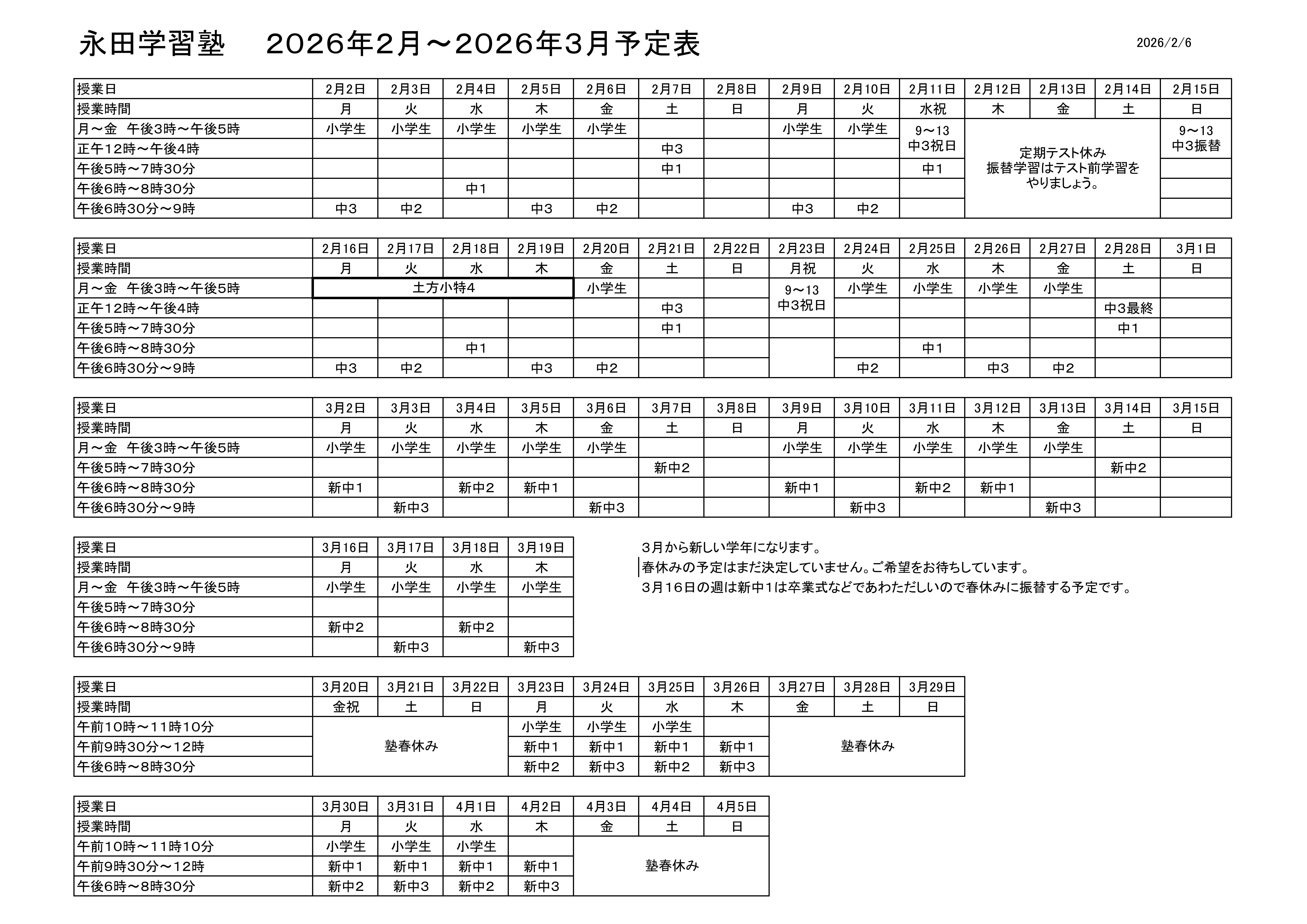 永田塾では、2月分のお月謝で、3月4日火曜日まで学習ができます。